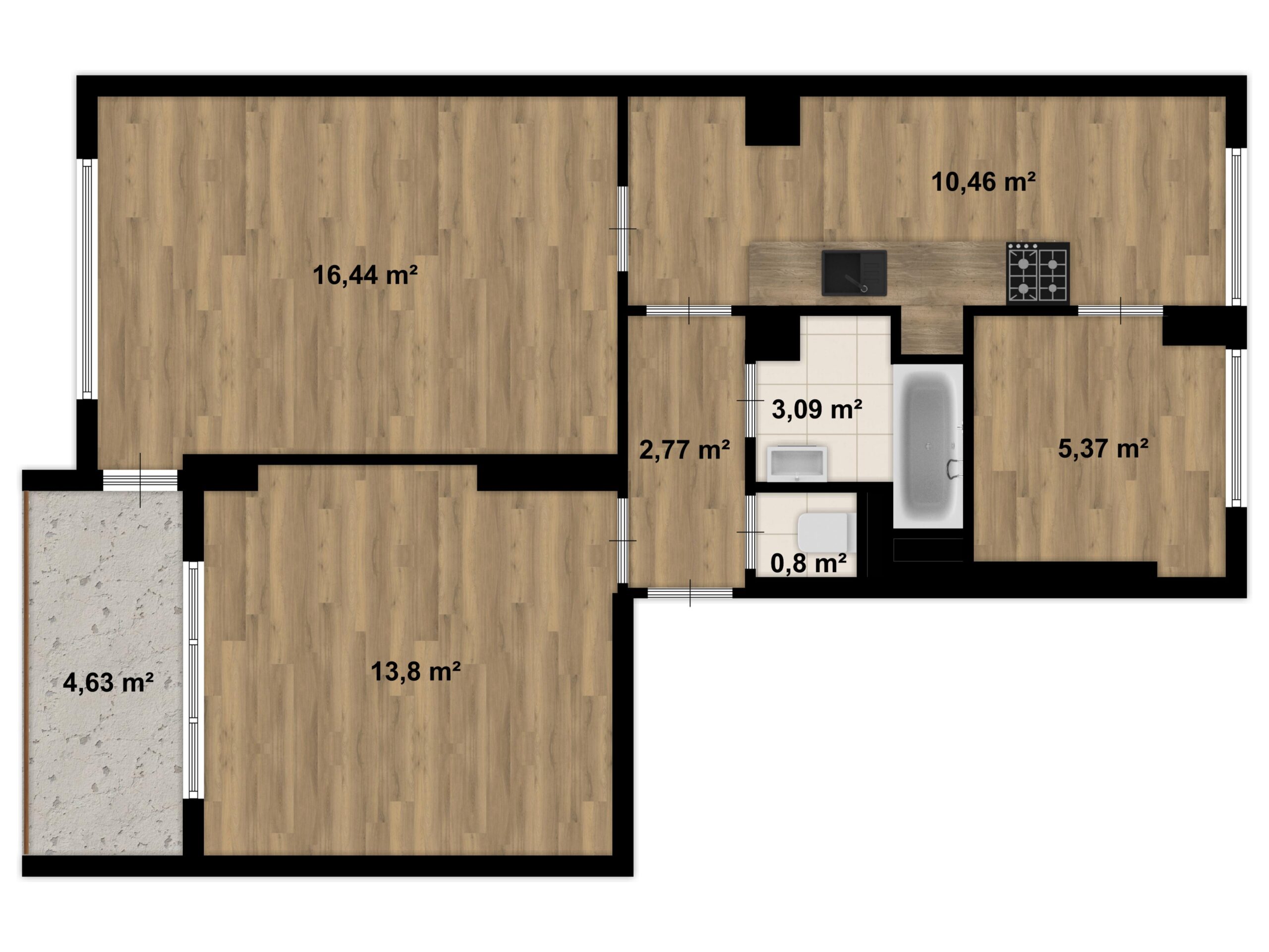 Jednotka je situovaná ve 2. nadzemním podlaží menšího, komorního cihlového domu. Stávající dispozice nabízí 3 místnosti (dvě ložnice a jedna menší místnost), kuchyň a chodbu, ze které je přístupná koupelna a samostatné WC.