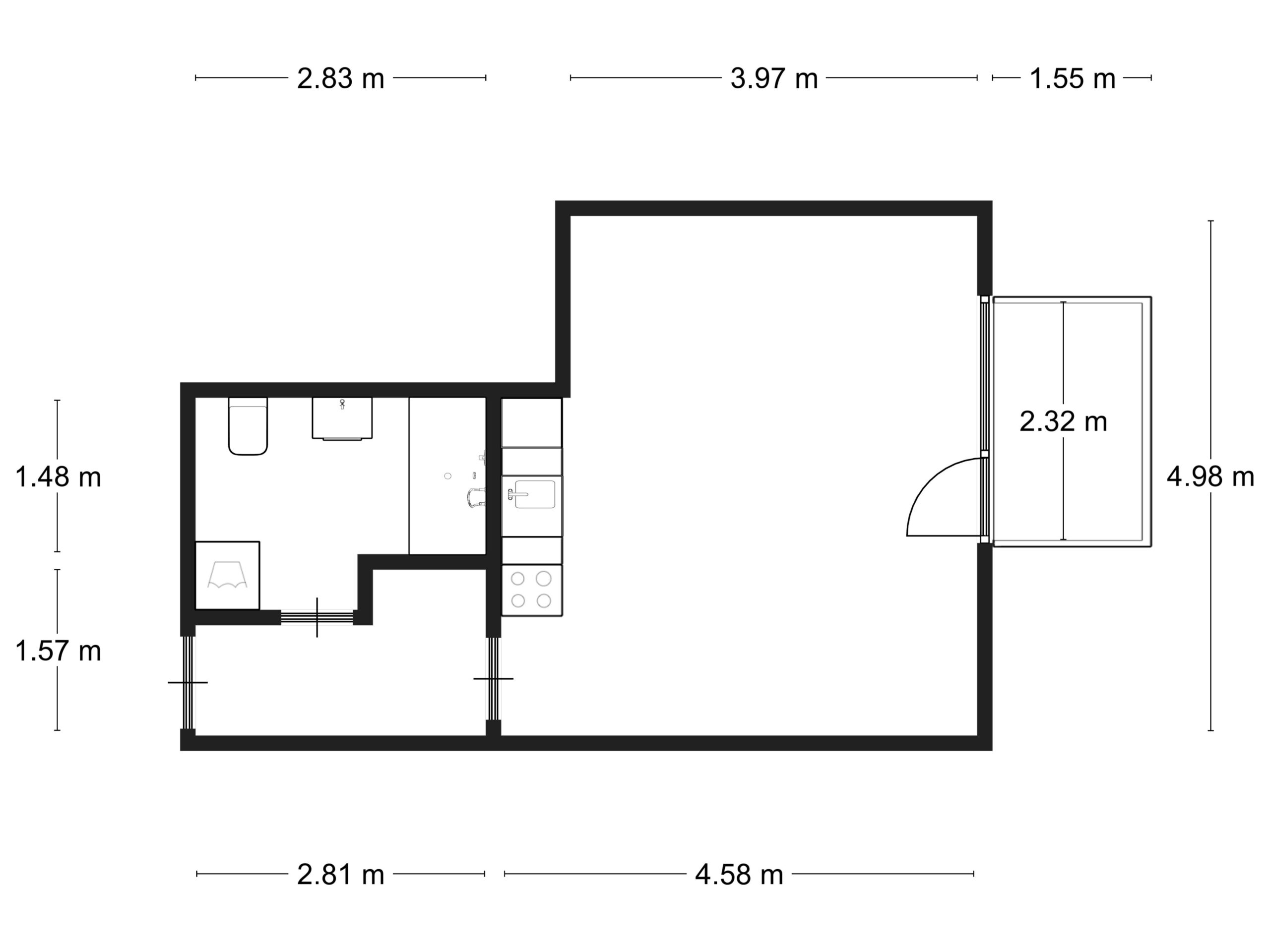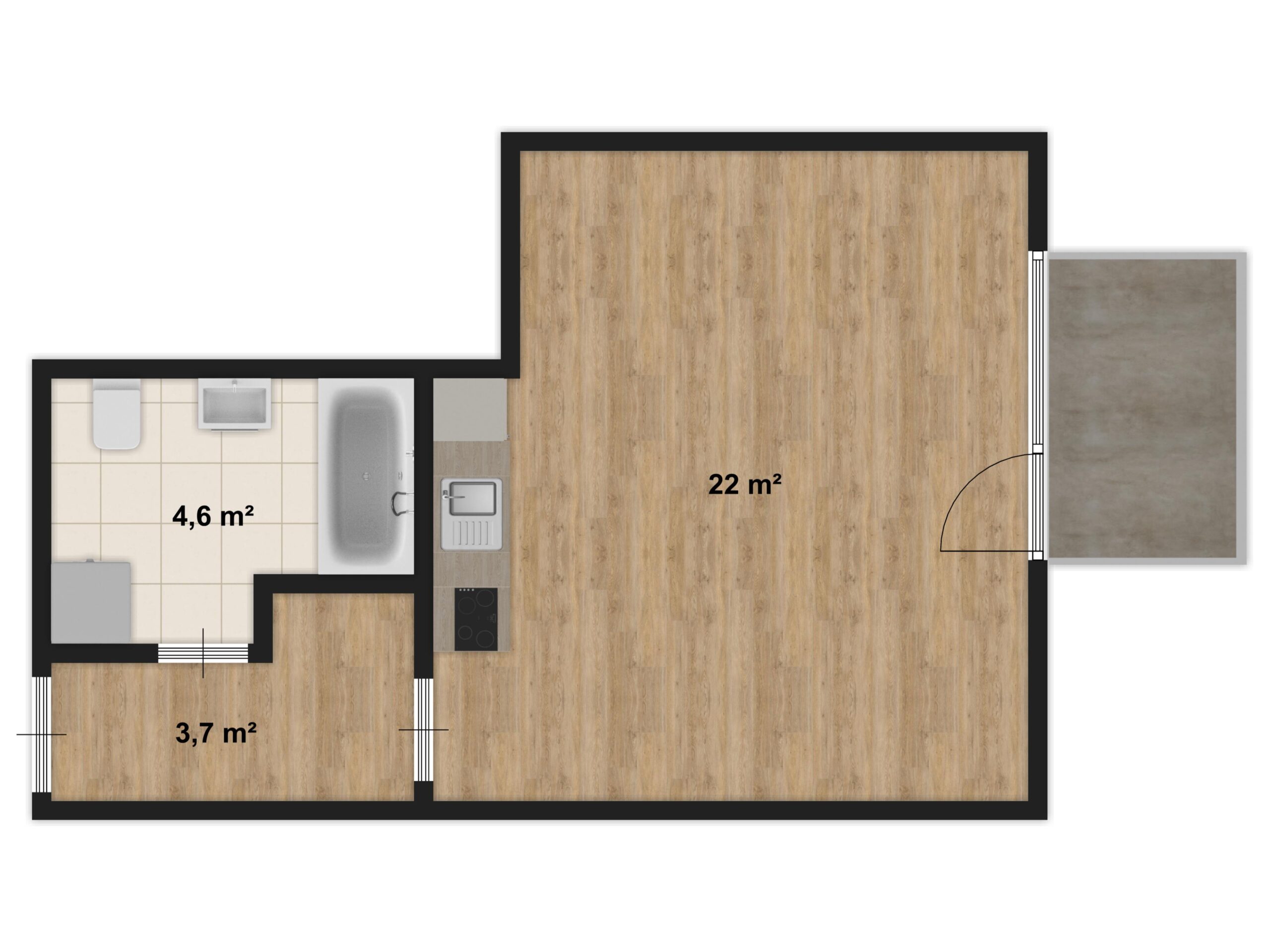 Byt je situován ve 4. nadzemním podlaží bytového domu z roku 2018. Ze vstupní chodby je přístupná prostorná koupelna s vanou, WC a místem pro pračku a také hlavní obytná místnost s kuchyňským koutem. V obývací části je dost prostoru pro jídelní kout i spací část. Celý byt je světlý a působí vzdušně. To díky velkému francouzskému oknu se vstupem na balkón a také výborné orientaci na jihovýchod.