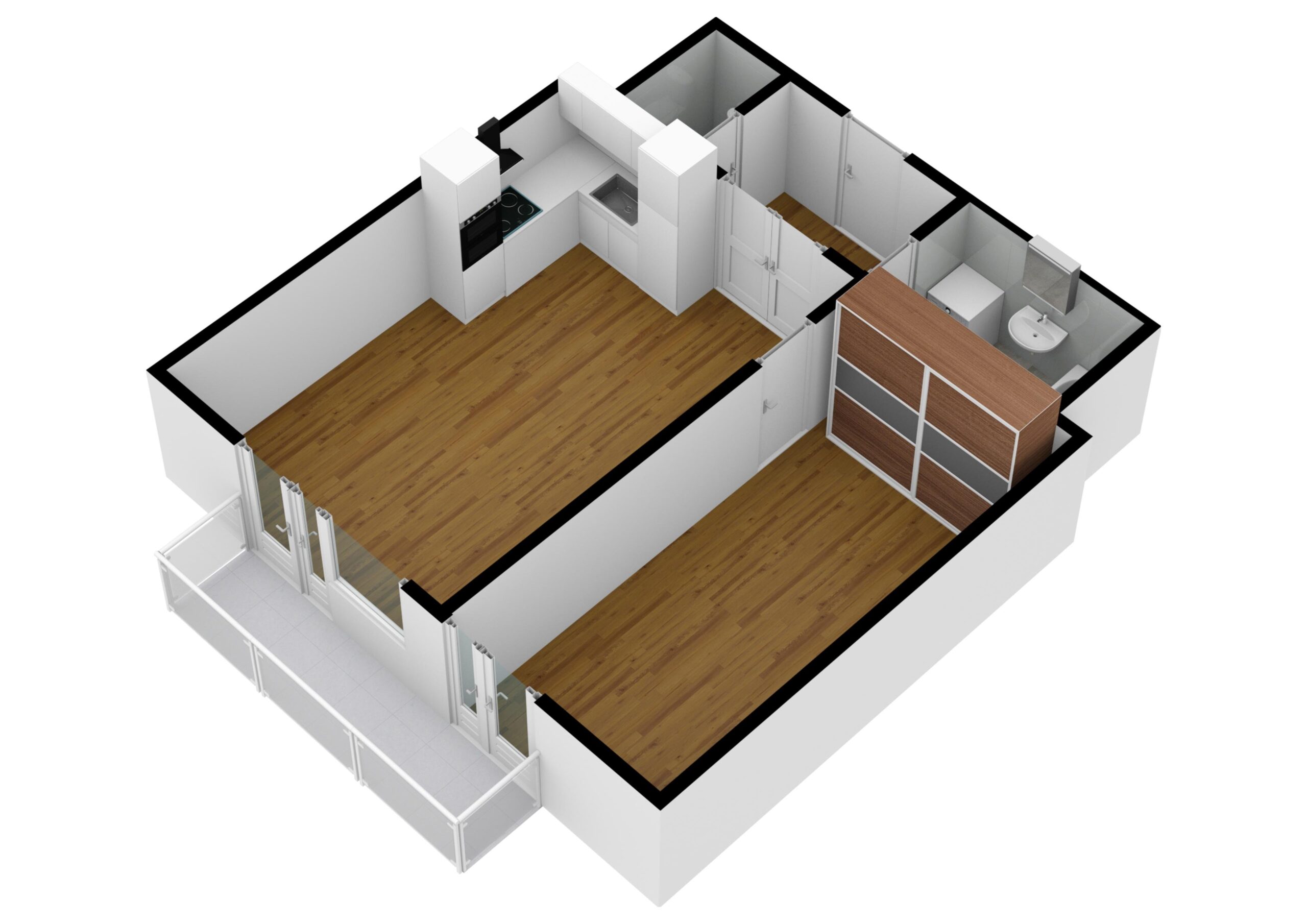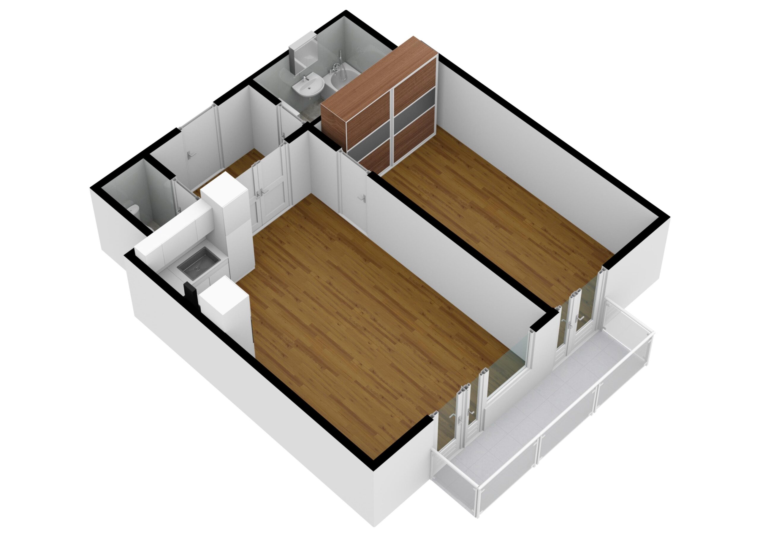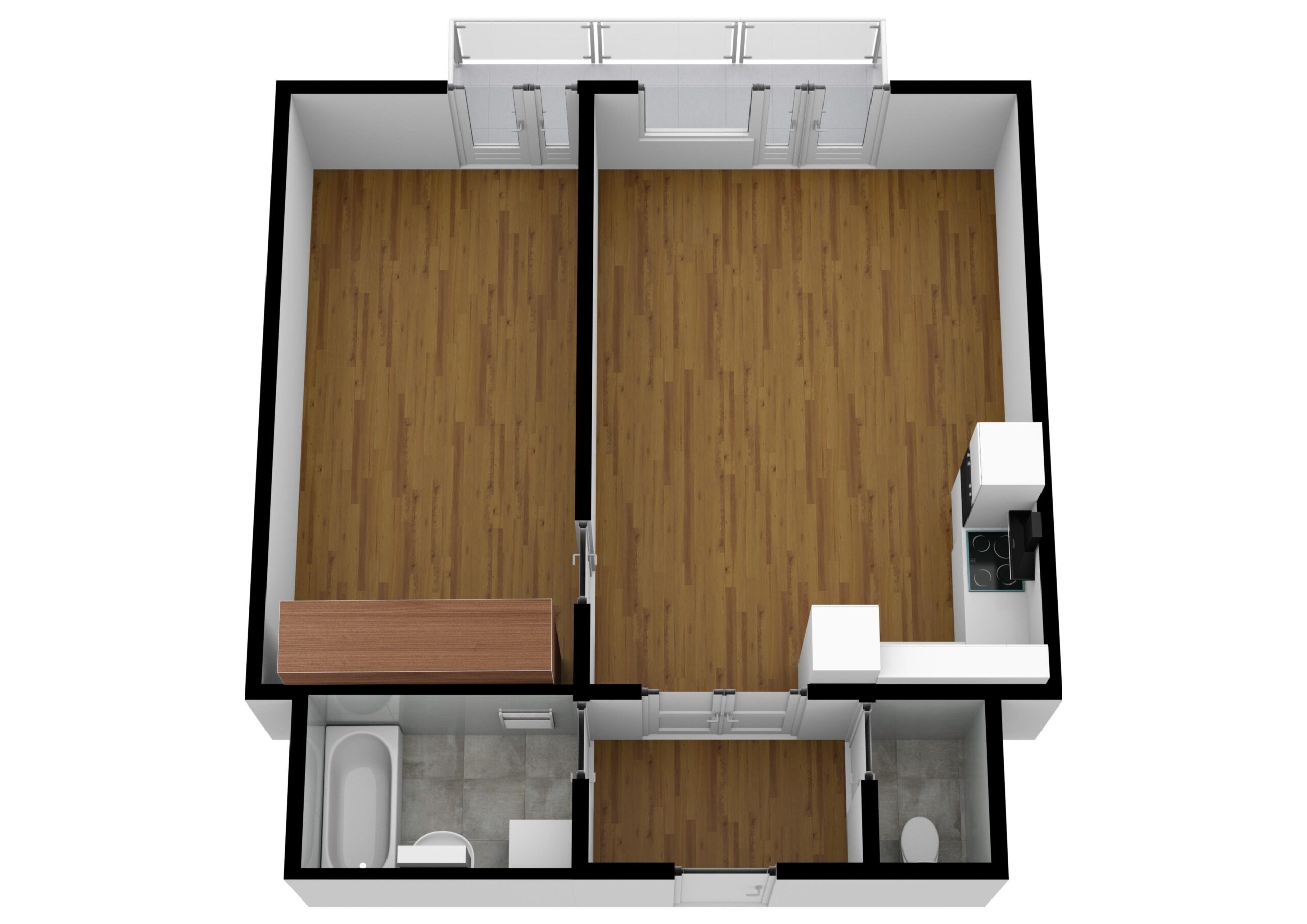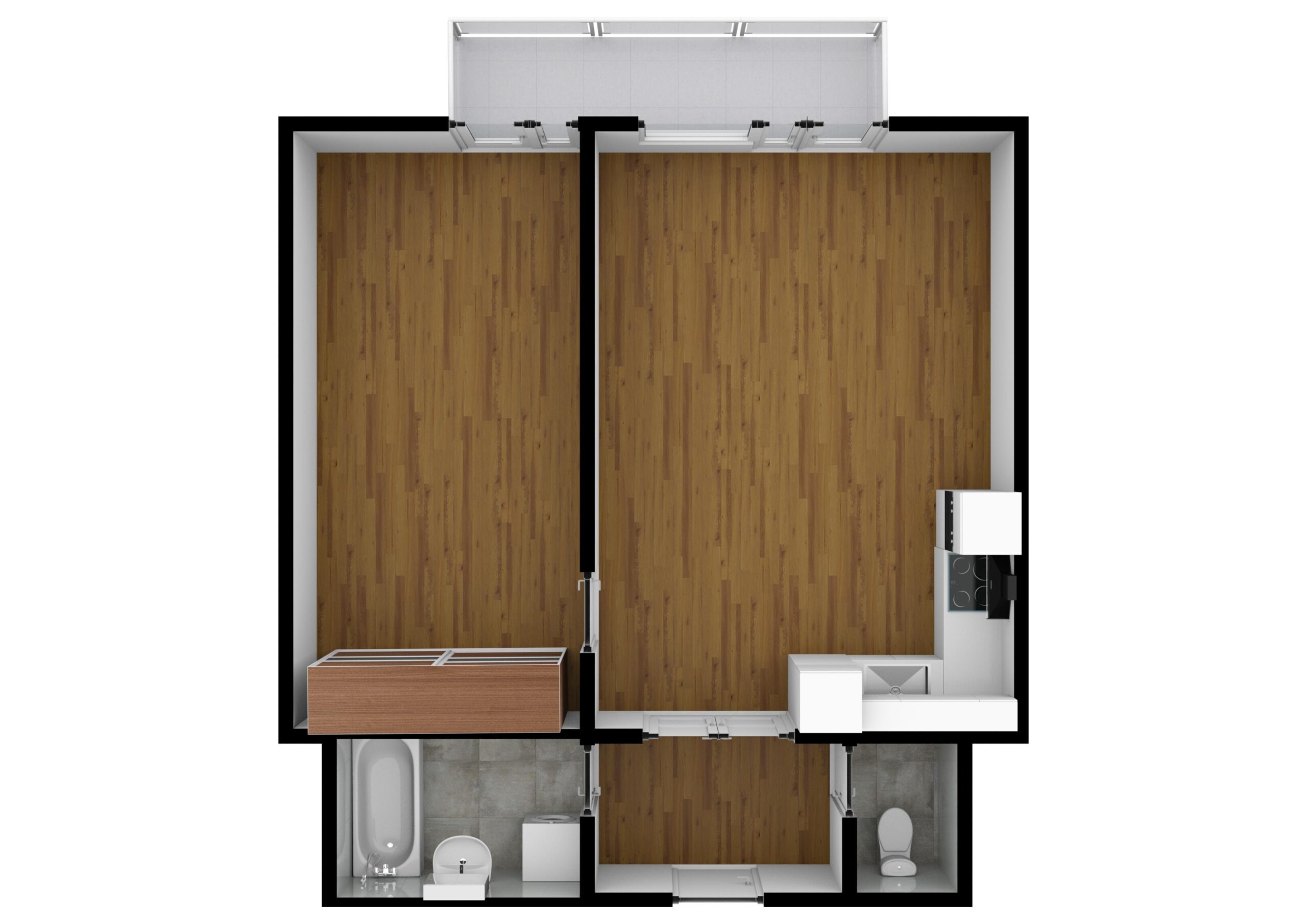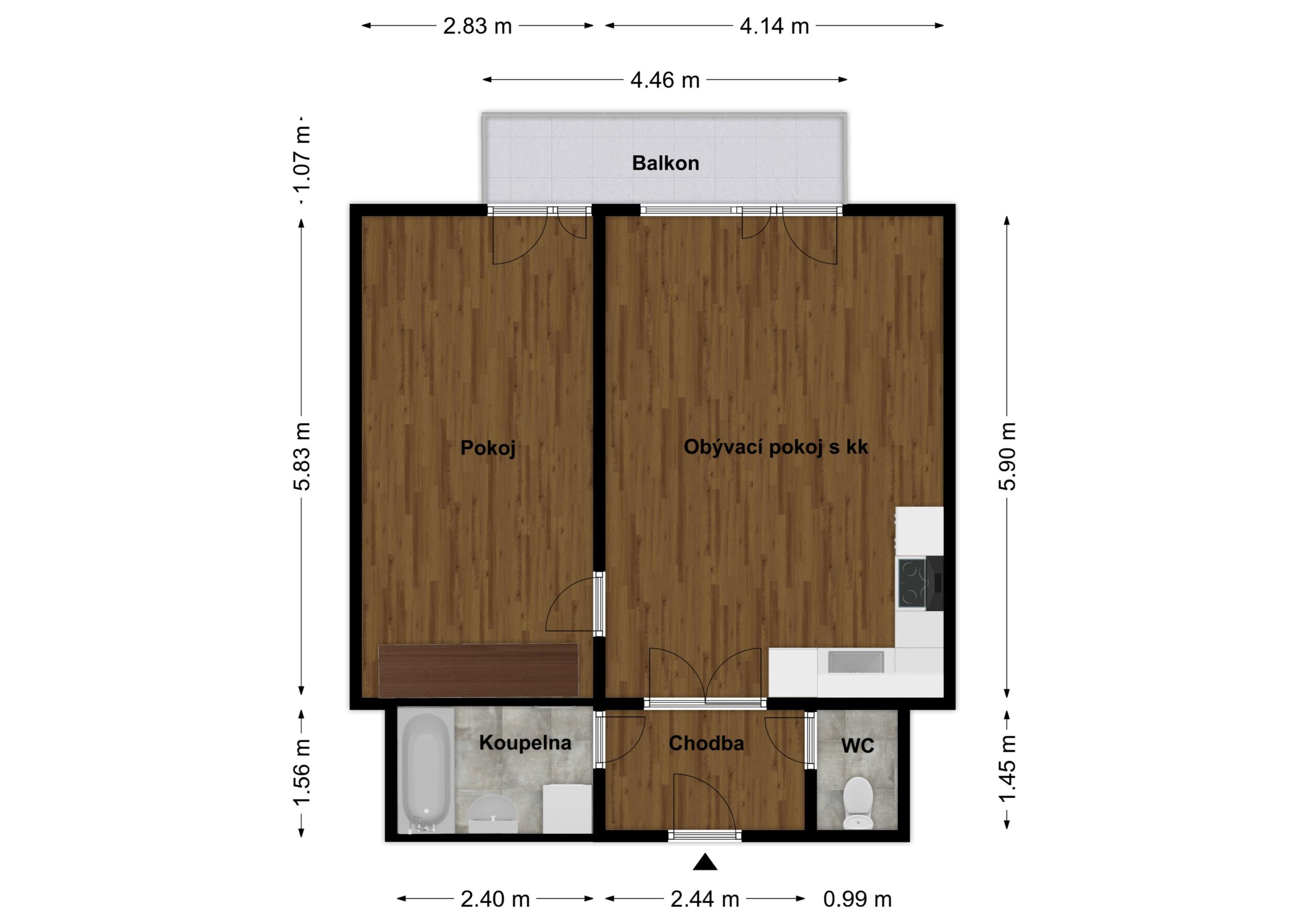 Jednotka je situována ve 3. nadzemním podlaží. Z předsíně je přístup na oddělené WC, koupelnu a do obývacího pokoje s elegantní kuchyňskou linkou. Jak z obývacího pokoje, tak i ložnice je poté vstup na balkón.