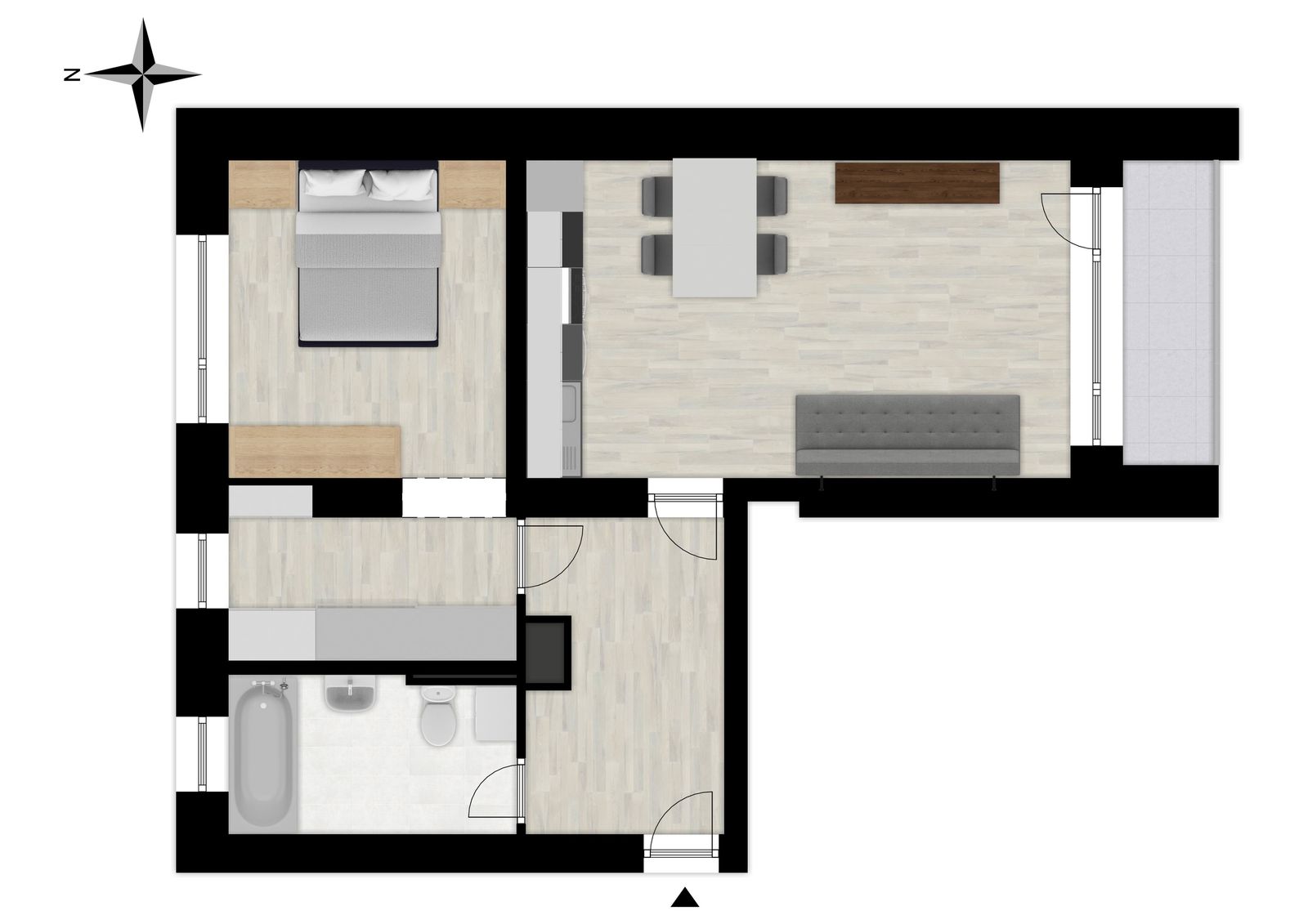 Jednotka maximálně efektivně využívá oblíbenou dispozici 2+kk. Z chodby je přístupná prostorná koupelna, ložnice s prakticky vybudovanou šatnou a obývací pokoj s kuchyňským koutem a se vstupem na zasklennou lodžii. Byt je vybaven kvalitní kuchyňskou linkou včetně spotřebičů (sporák, trouba, digestoř, myčka) a je připraven k okamžitému využití. Ať již pro vlastní bydlení či na pronájem. Příjemným bonusem je sklepní kóje v polosuterénu.