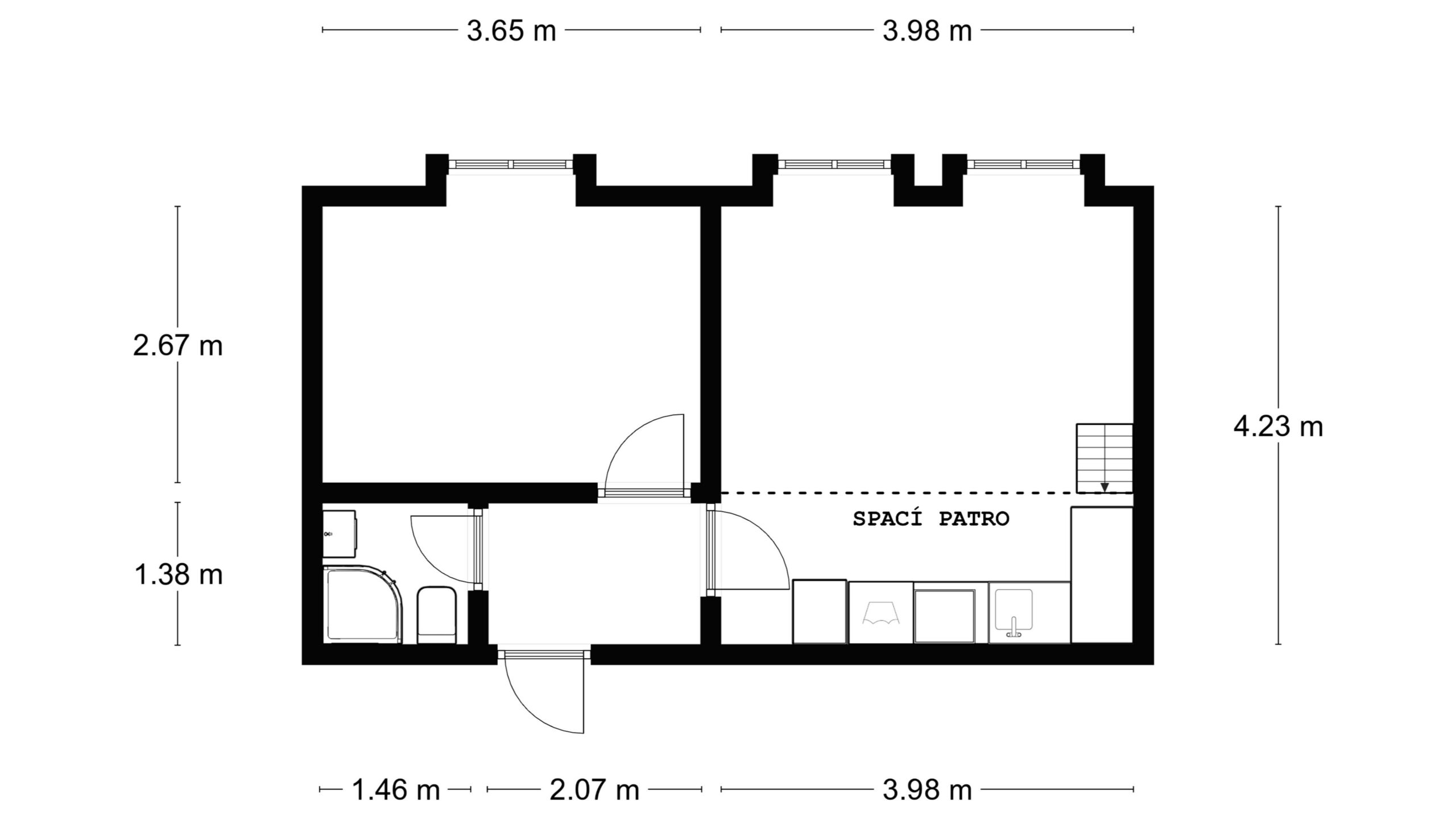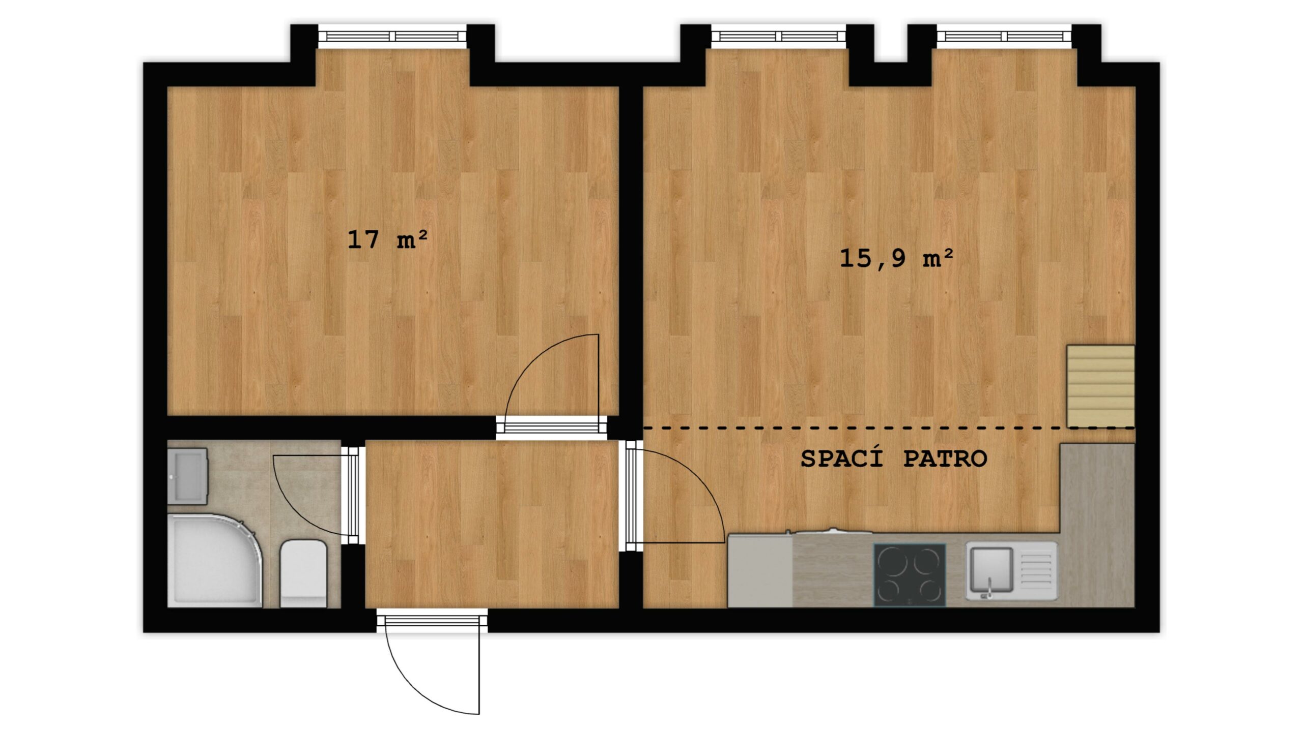 Praktická dispozice 2+kk využívá efektivně každý metr čtvereční, který zde máte k dispozici. Z předsíně je vstup do koupelny se sprchovým koutem a WC, do ložnice a také do hlavní obytné místnosti, obývacího pokoje s kuchyňským koutem. Vysoké stropy zajišťují jak příjemnou vzdušnou atmosféru, tak přináší i dostatek místa. Tento potenciál je plně využit nad kuchyňským koutem, kde najdete praktické dřevěné patro. Můžete jej využít jako další místo ke spaní či jako nadstandardní úložný prostor.