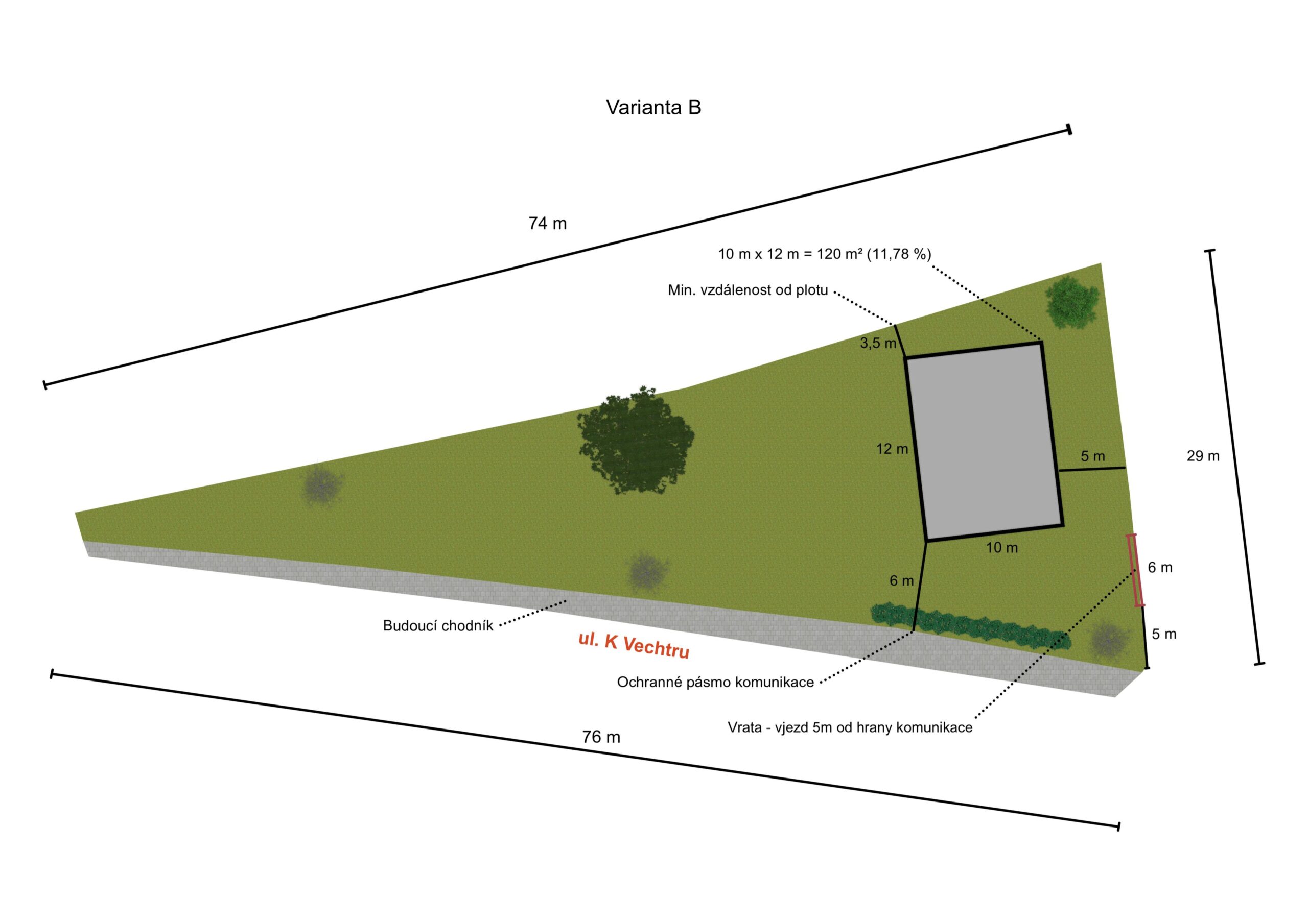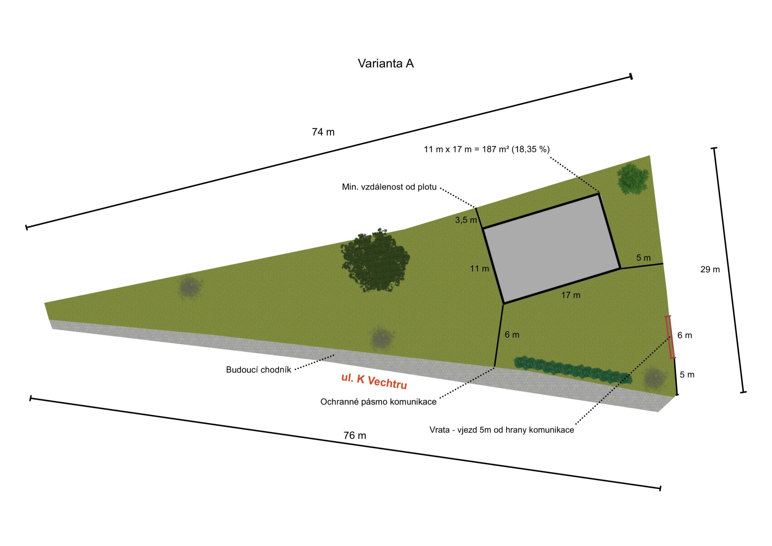 Tvar pozemku nabízí řadu možností jak umístit stavbu rodinného domu. Regulativy jsou standardní pro tuto lokalitu: koef. zastavěnosti max. 30%, max. dvoupodlažní budovy s výškou hřebene max. 9 m. Podrobnější podklady máme pro zájemce připravené a rádi je zašleme emailem spolu s dalšími užitečnými informacemi.