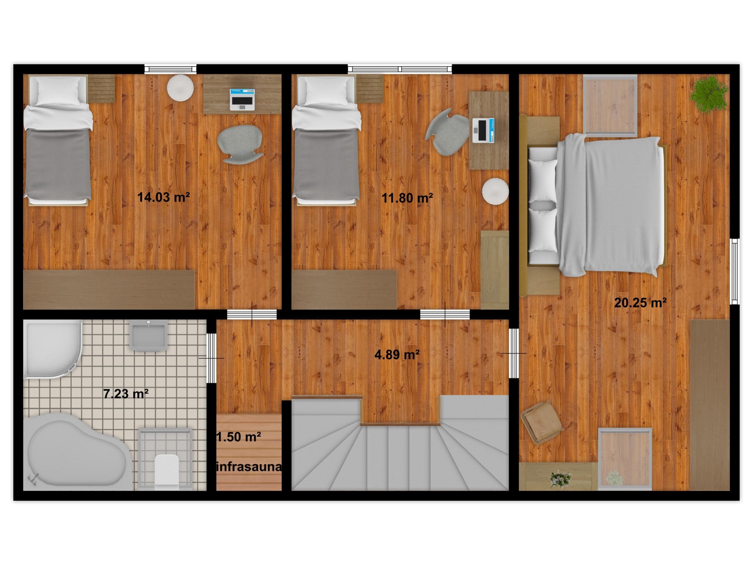 Příjemným bonusem je chytře umístěná infrasauna, která vám udělá radost nejen v nadcházejícím podzimu a zimě. Celý dům je vytápěn podlahovým topením. Tedy žádné radiátory narušující prostor a efektivní výkon a nízké náklady. Vodu potom ohřívá elektrický bojler. Celkové náklady jsou velmi nízké, což je obzvlášť v dnešní době další přidaná hodnota této nemovitosti.