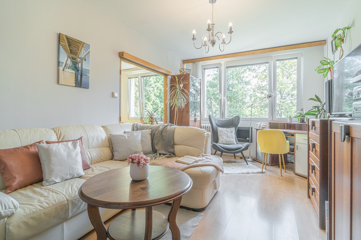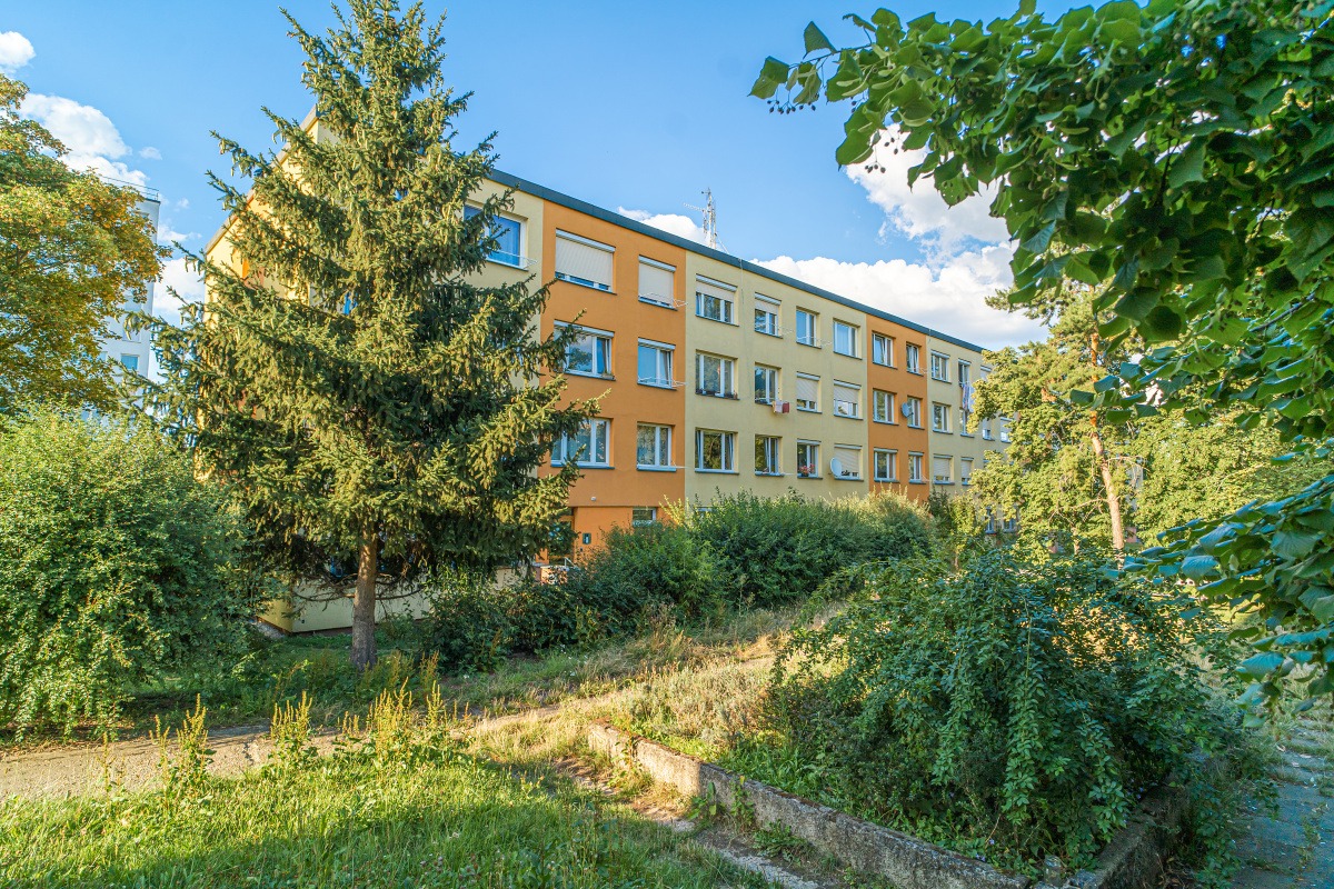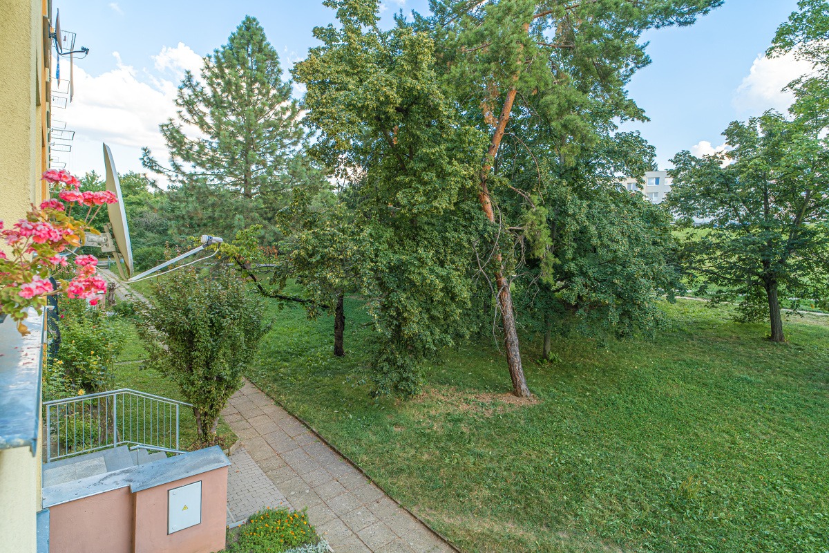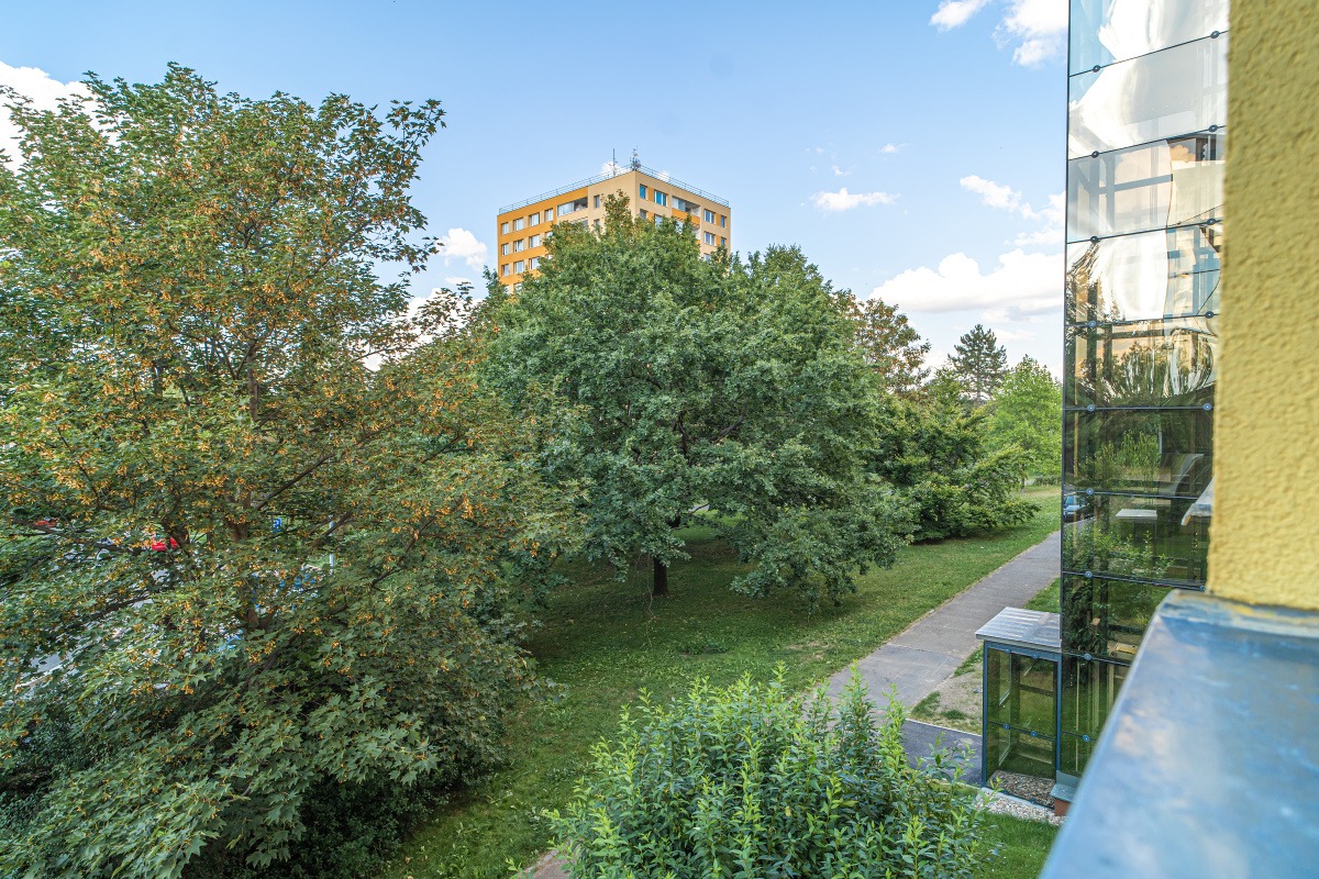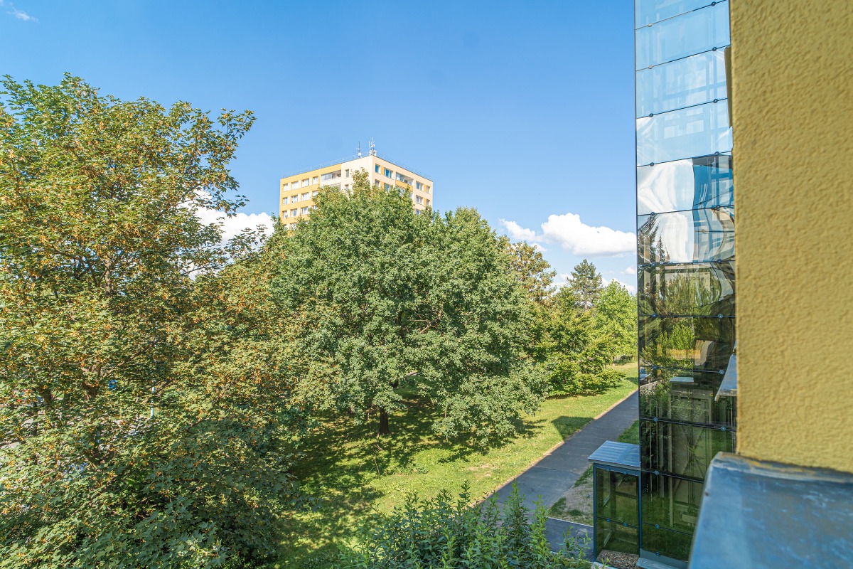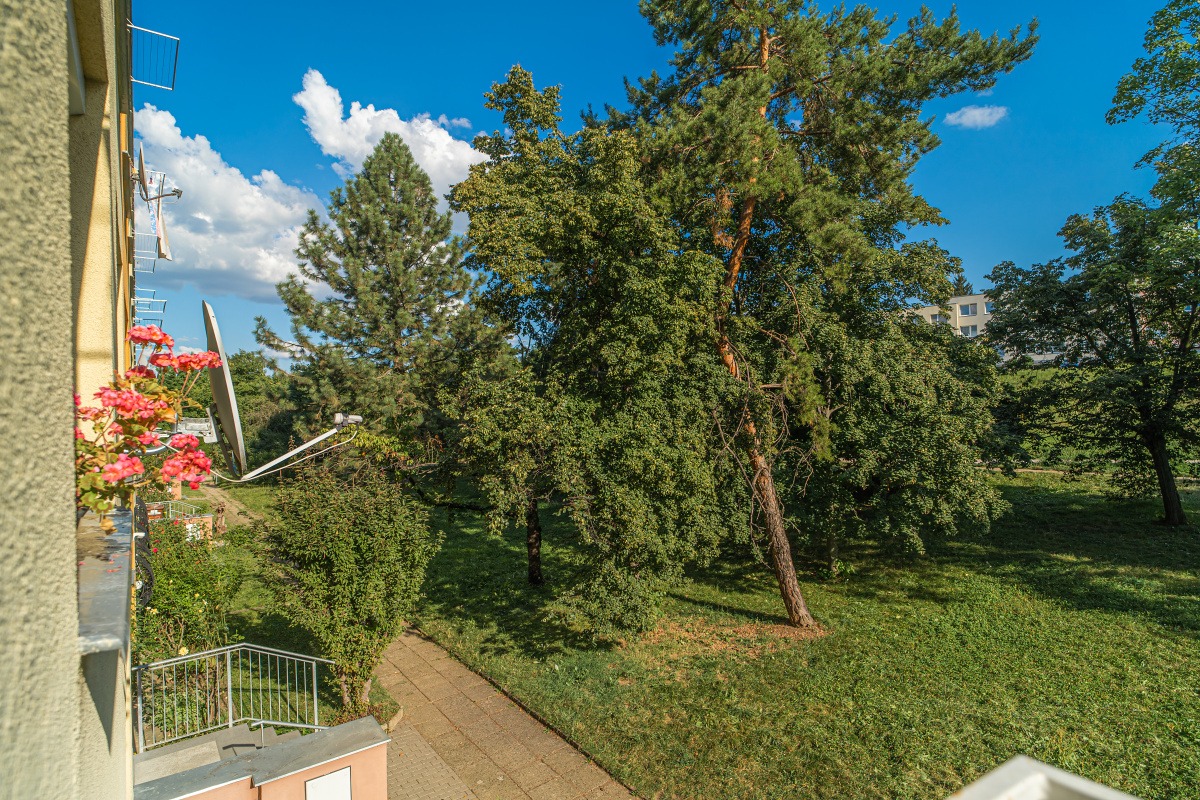 Oblíbená dispozice 3+1 nabízí dvě neprůchozí ložnice, samostatnou koupelnu, WC a komoru a obývací pokoj částečně spojený s kuchyní. Byt byl průběžně a pečlivě udržován a je možné jej okamžitě využívat. Na druhou stranu je v bytě ještě původní umakartové jádro, jehož rekonstrukcí posunete potenciál a využití bytu na vyšší úroveň. Kuchyň a obývací pokoj jsou orientovány na jih, ložnice pak na sever – ideální kombinace, kdy denní místnosti mají dostatek světla a naopak klidová část bytu je spíše ve stínu.