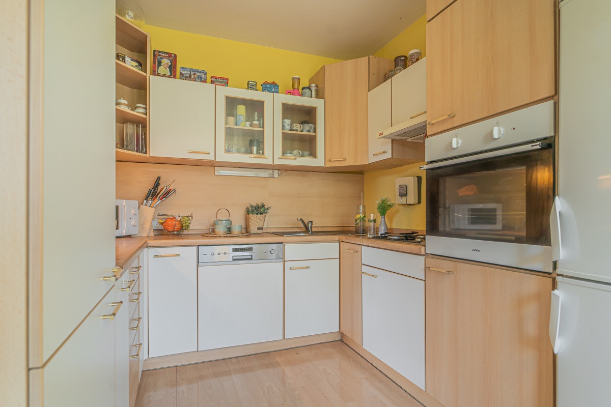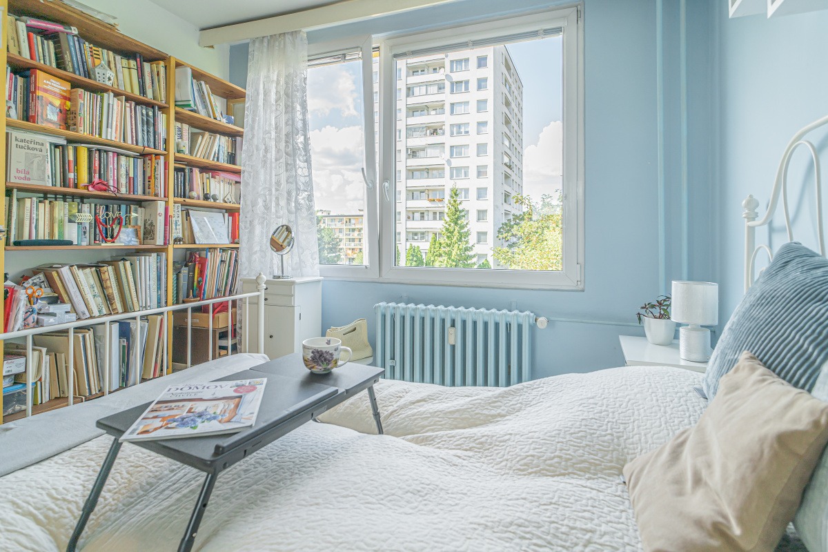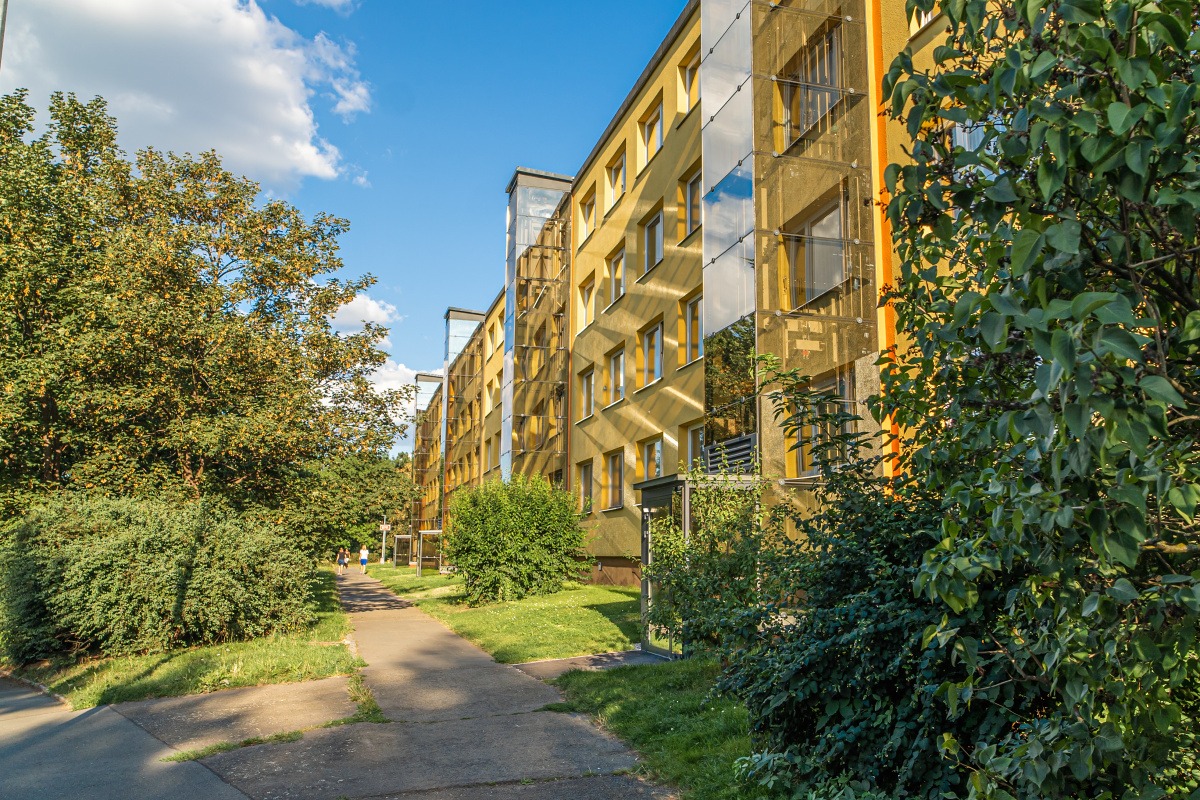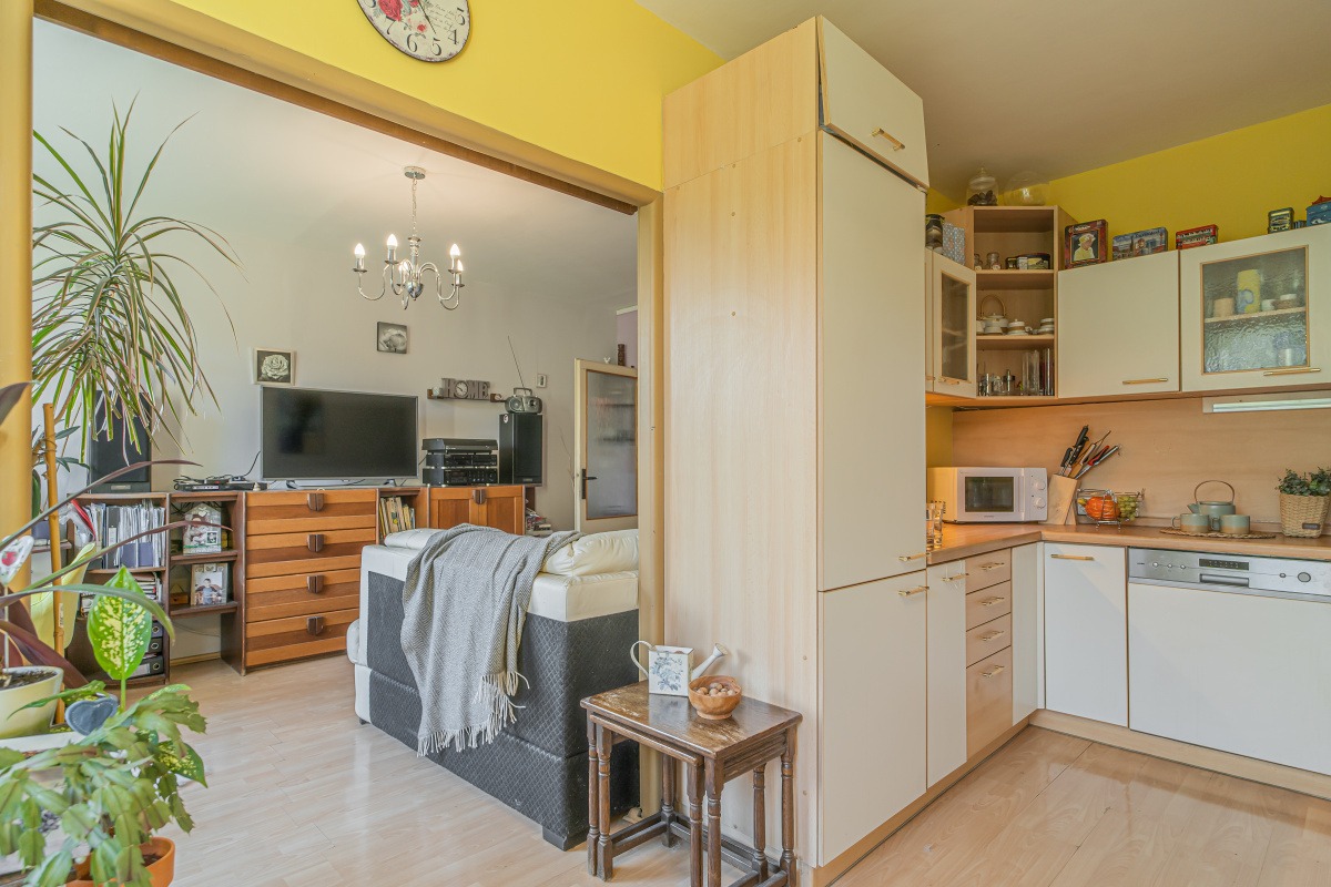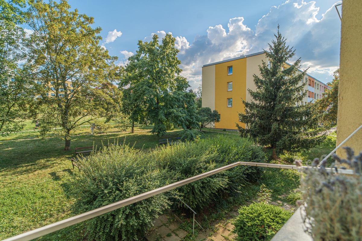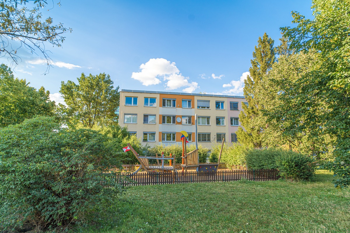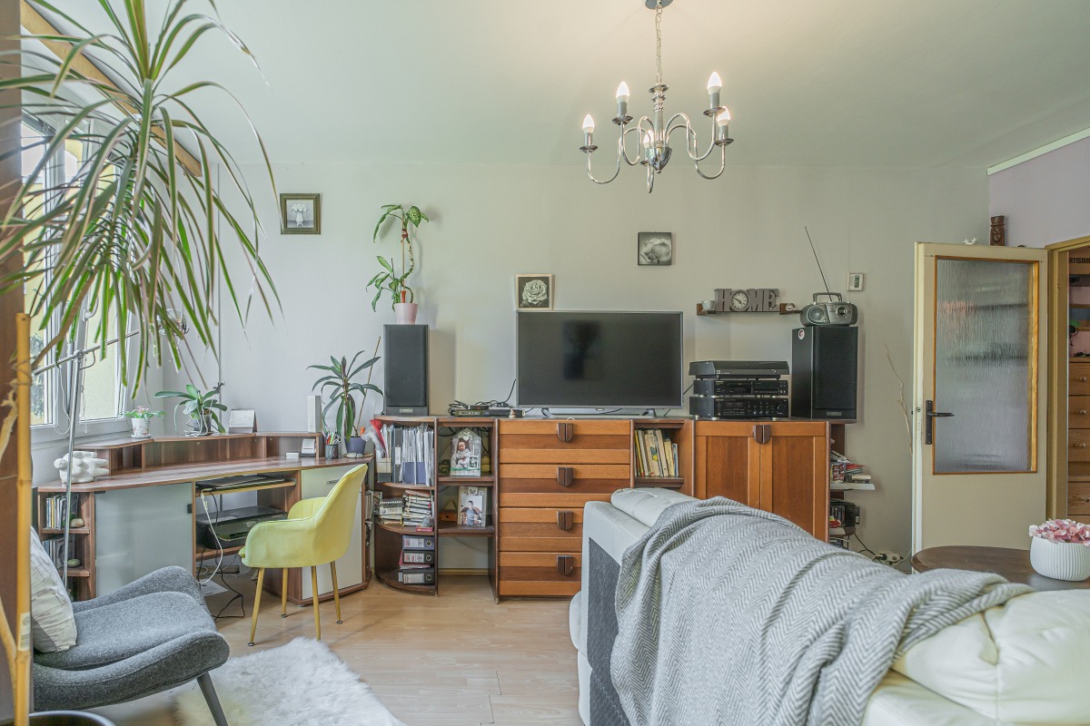 Oblíbená dispozice 3+1 nabízí dvě neprůchozí ložnice, samostatnou koupelnu, WC a komoru a obývací pokoj částečně spojený s kuchyní. Byt byl průběžně a pečlivě udržován a je možné jej okamžitě využívat. Na druhou stranu je v bytě ještě původní umakartové jádro, jehož rekonstrukcí posunete potenciál a využití bytu na vyšší úroveň. Kuchyň a obývací pokoj jsou orientovány na jih, ložnice pak na sever – ideální kombinace, kdy denní místnosti mají dostatek světla a naopak klidová část bytu je spíše ve stínu.