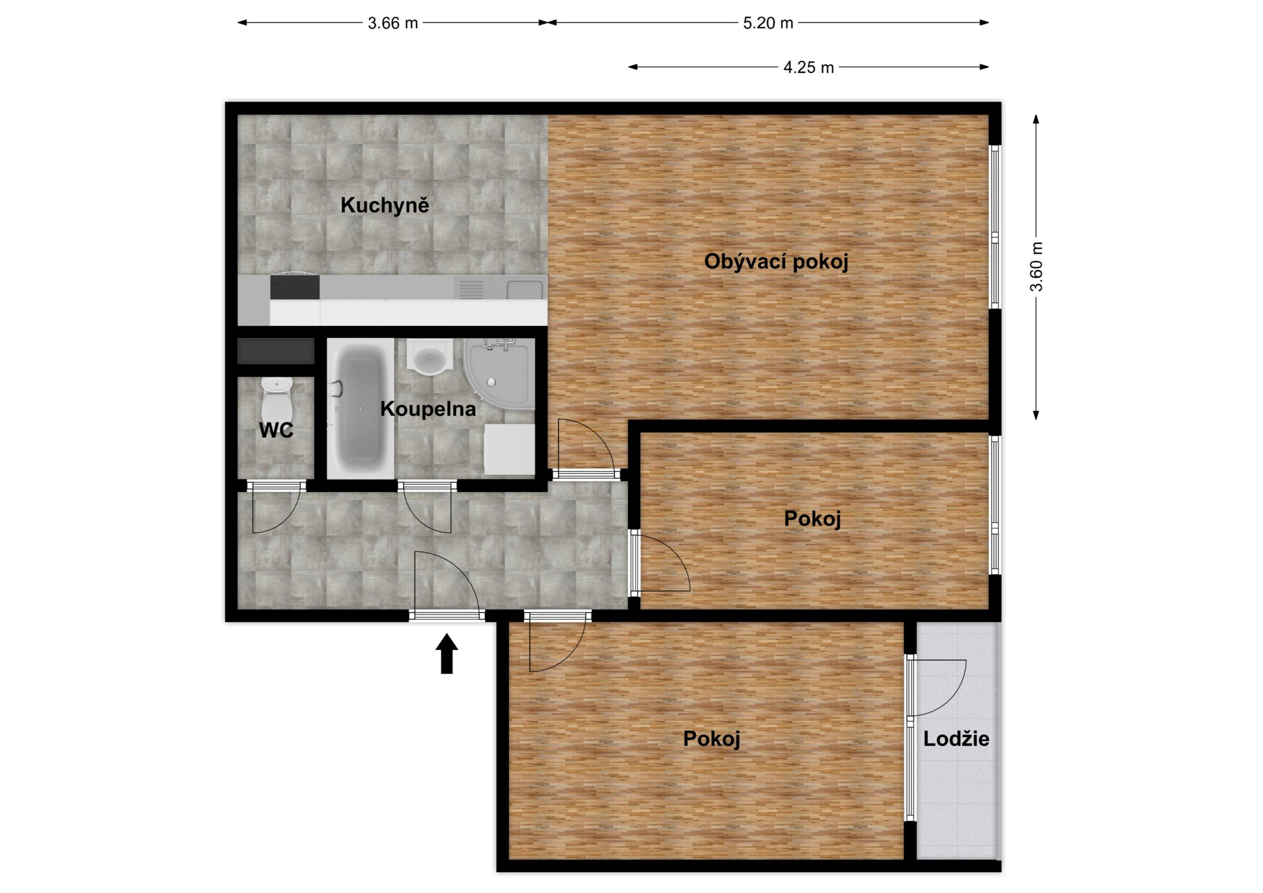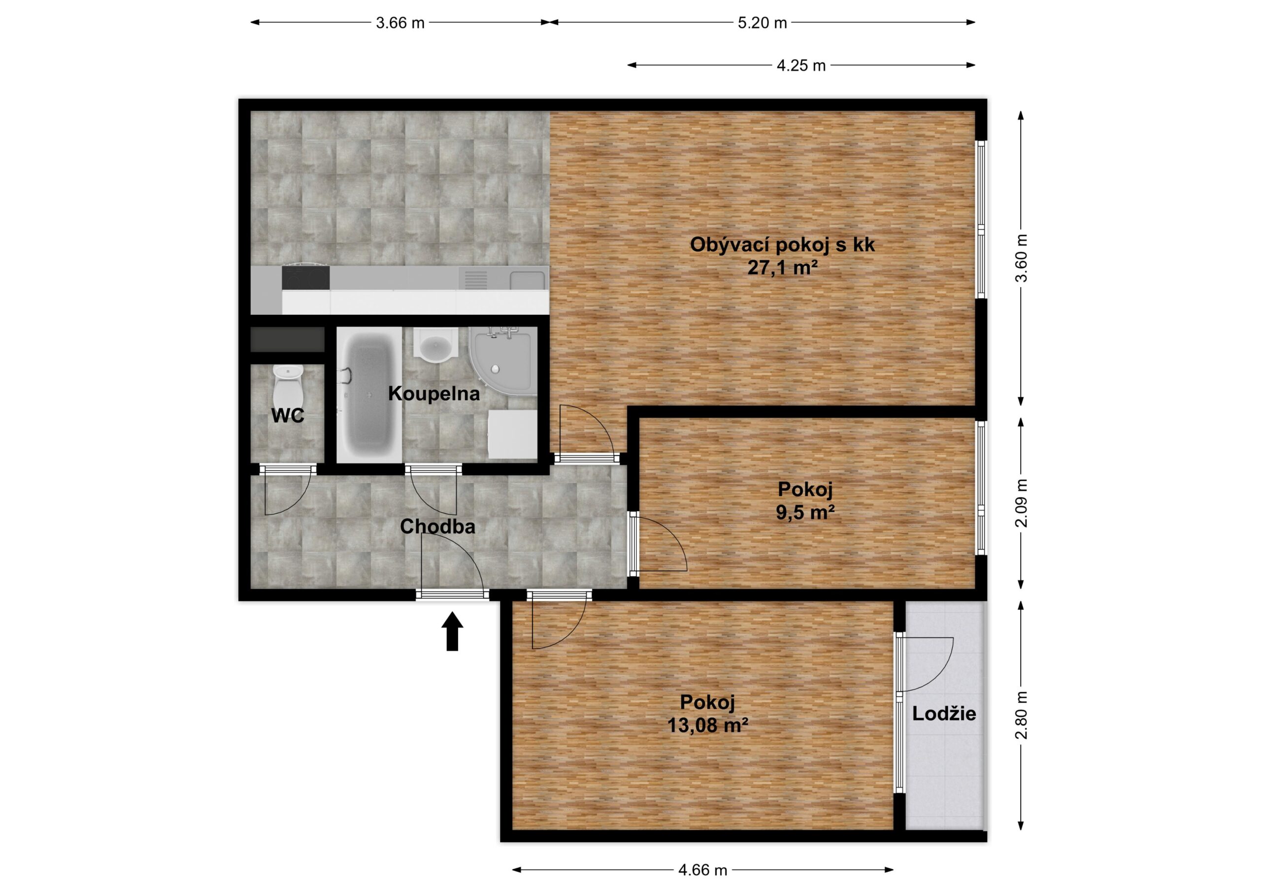 Byt se nachází v 1. patře dobře udržovaného bytového domu (revitalizovaná střecha, fasáda, stoupačky i plastová okna). Praktická dispozice nabízí dvě neprůchozí ložnice, přičemž z jedné je vstup na lodžii. Centrem bytu je obývací pokoj s kuchyňským koutem. Z chodby je pak přístupné samostatné WC a prostorná koupelna s vanou i sprchovým koutem.