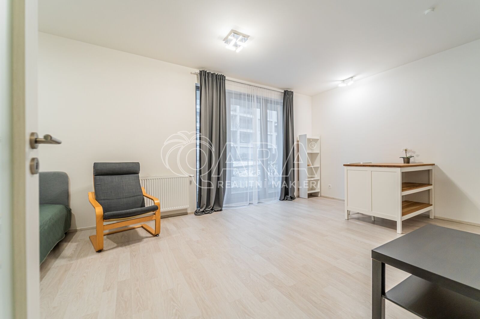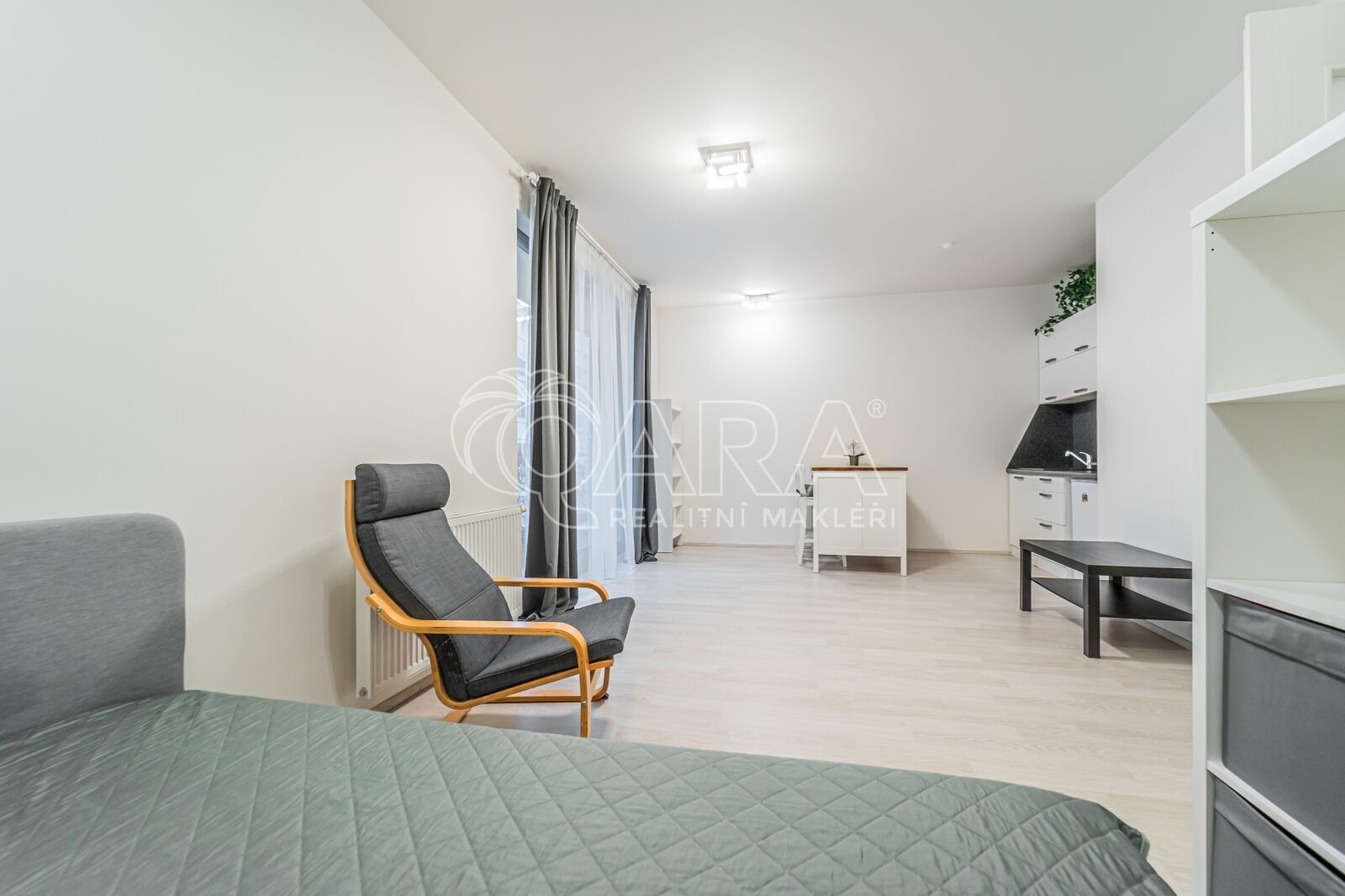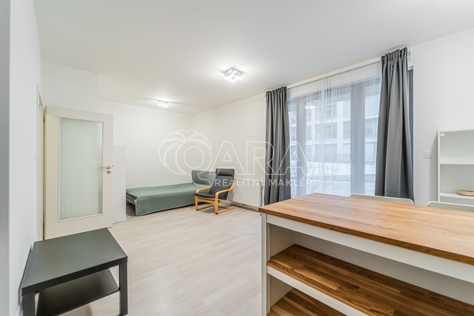 Ateliér je částečně zařízen – k dispozici je skříň, komoda, police a postel o šířce 140 cm.