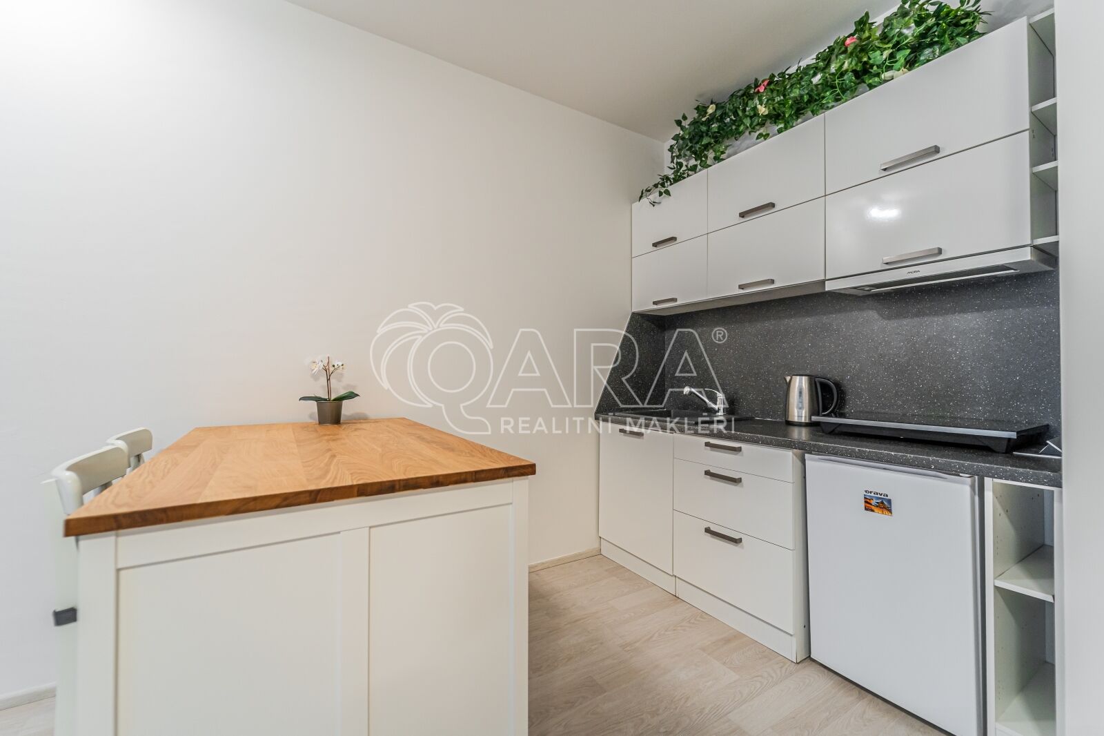 Hlavní obytný prostor o velikosti 27 m² je vybaven kuchyňskou linkou s moderními elektrospotřebiči (lednička, indukční vařič, digestoř).